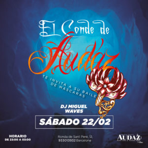 En Audaz te invitamos a nuestro divertido baile de máscaras, que podréis disfrutar este sábado 22 de febrero. De 23:00 a 03:00h. Con la participación del DJ Miguel Waves el cual se encargará de poner la música. Premios al mejor disfraz – TV 40″, Jamón Ibérico y un Spa para 2 personas. ¡ Un planazo que sin duda dará que hablar en Barcelona!